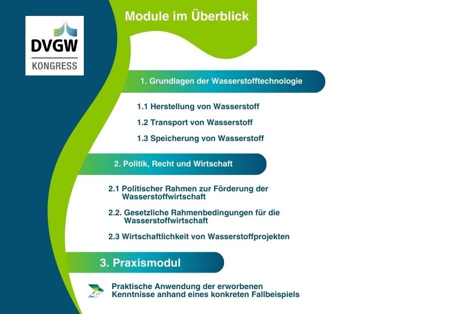In diesem Kurs erhalten Sie einen umfangreichen Überblick über die technischen, politischen, rechtlichen und wirtschaftlichen Rahmenbedingungen der Wasserstoffwirtschaft in kürzester Zeit. Ergänzend zu den technischen Grundlagen entlang der Wasserstoff-Wertschöpfungskette erwerben Sie angewandtes Fachwissen direkt von Expert:innen aus der Branche.